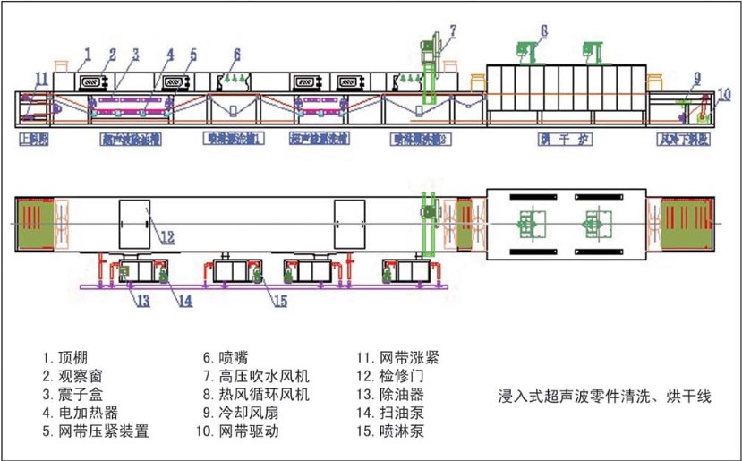 由機(jī)架、頂棚、超聲波除油槽、噴淋漂洗槽1、超聲波漂洗槽、噴淋漂洗槽2、循環(huán)副槽及過濾系統(tǒng)、油水分離系統(tǒng)、高壓風(fēng)機(jī)吹水系統(tǒng)、烘干爐、風(fēng)冷系統(tǒng)、傳動輸送系統(tǒng)、工件籃、電氣控制系統(tǒng)等組成。